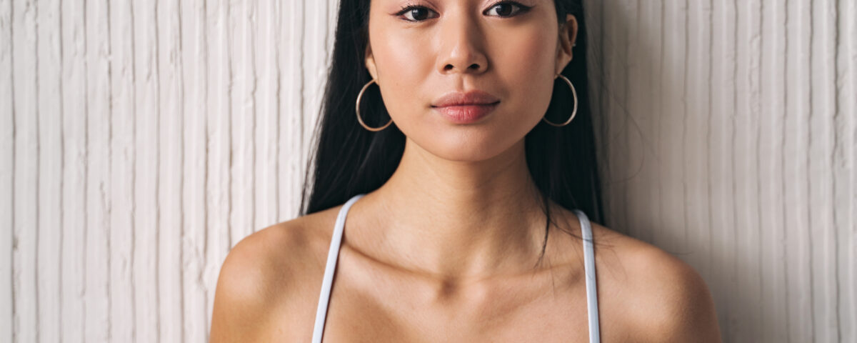 Portrait of beautiful korean woman with cute face, posing as asian model, standing against textured wall at home